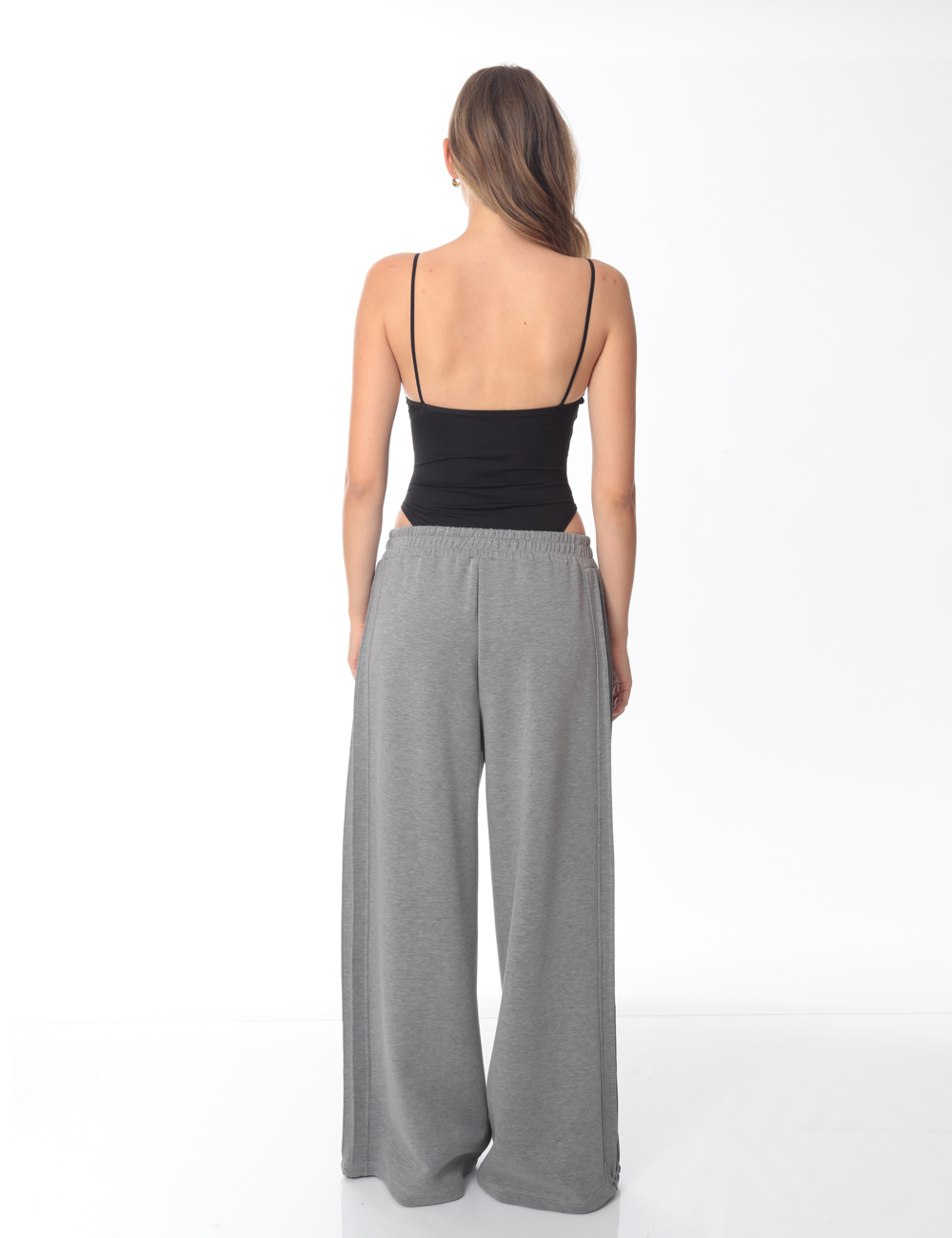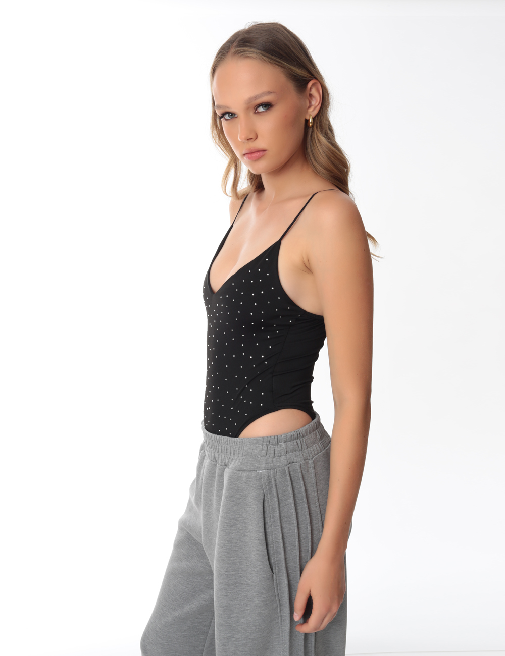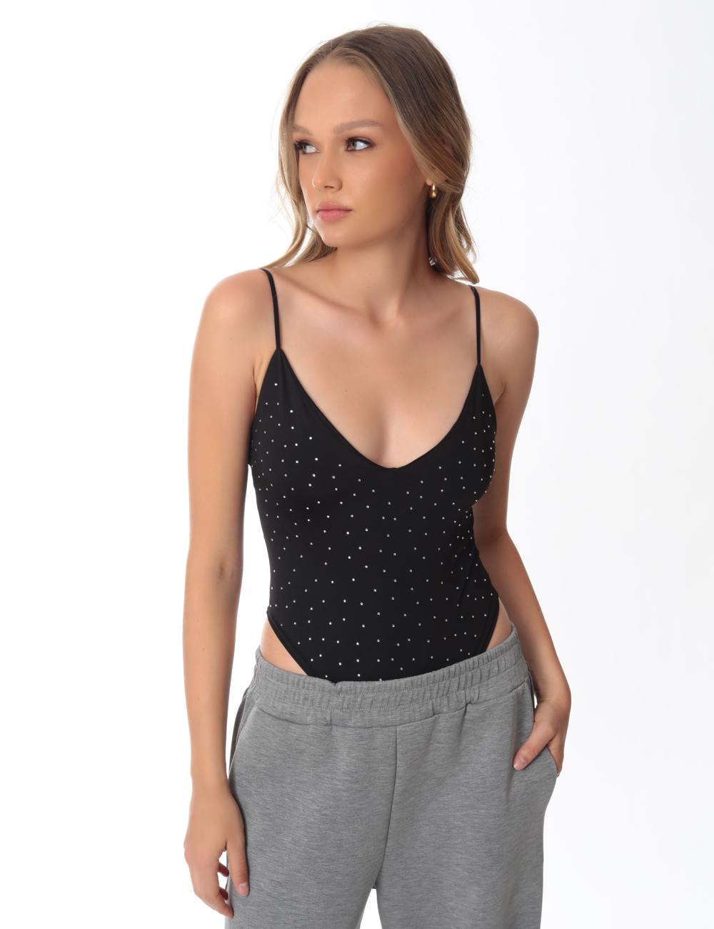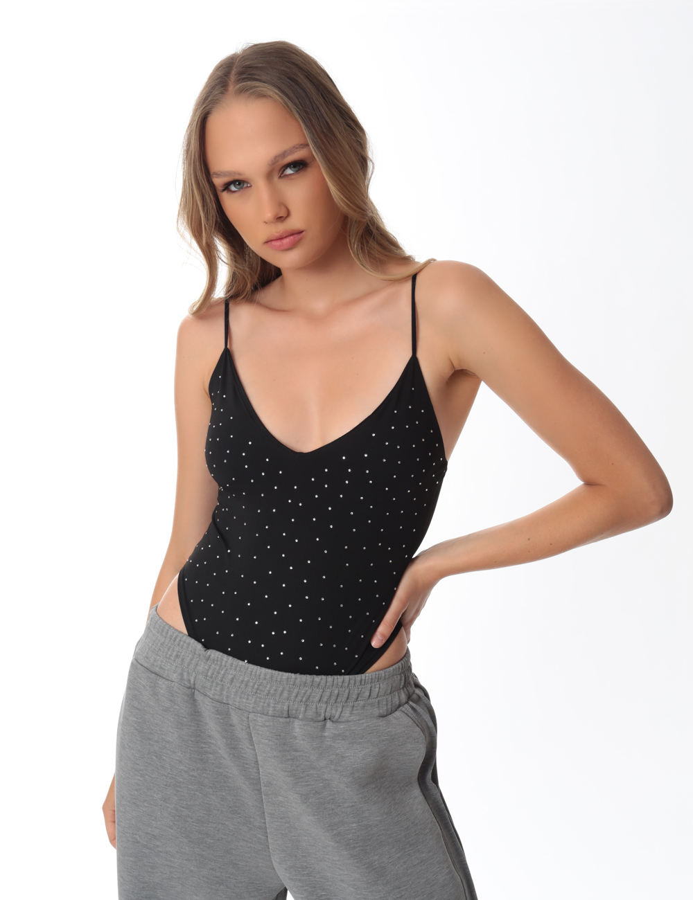 Black bodysuit with thin straps, V-neckline and rhinestone details all over.