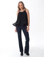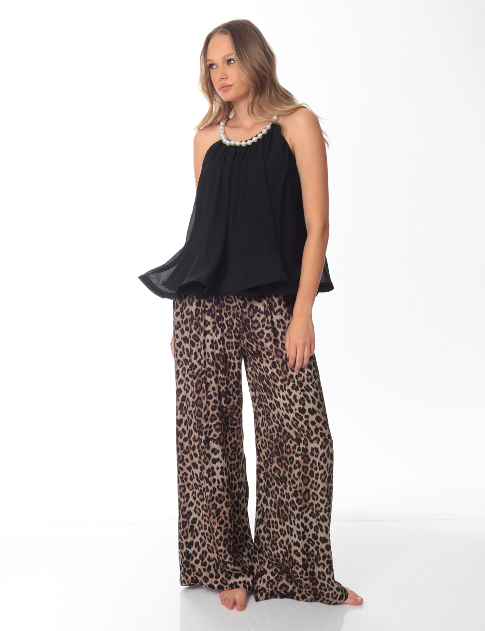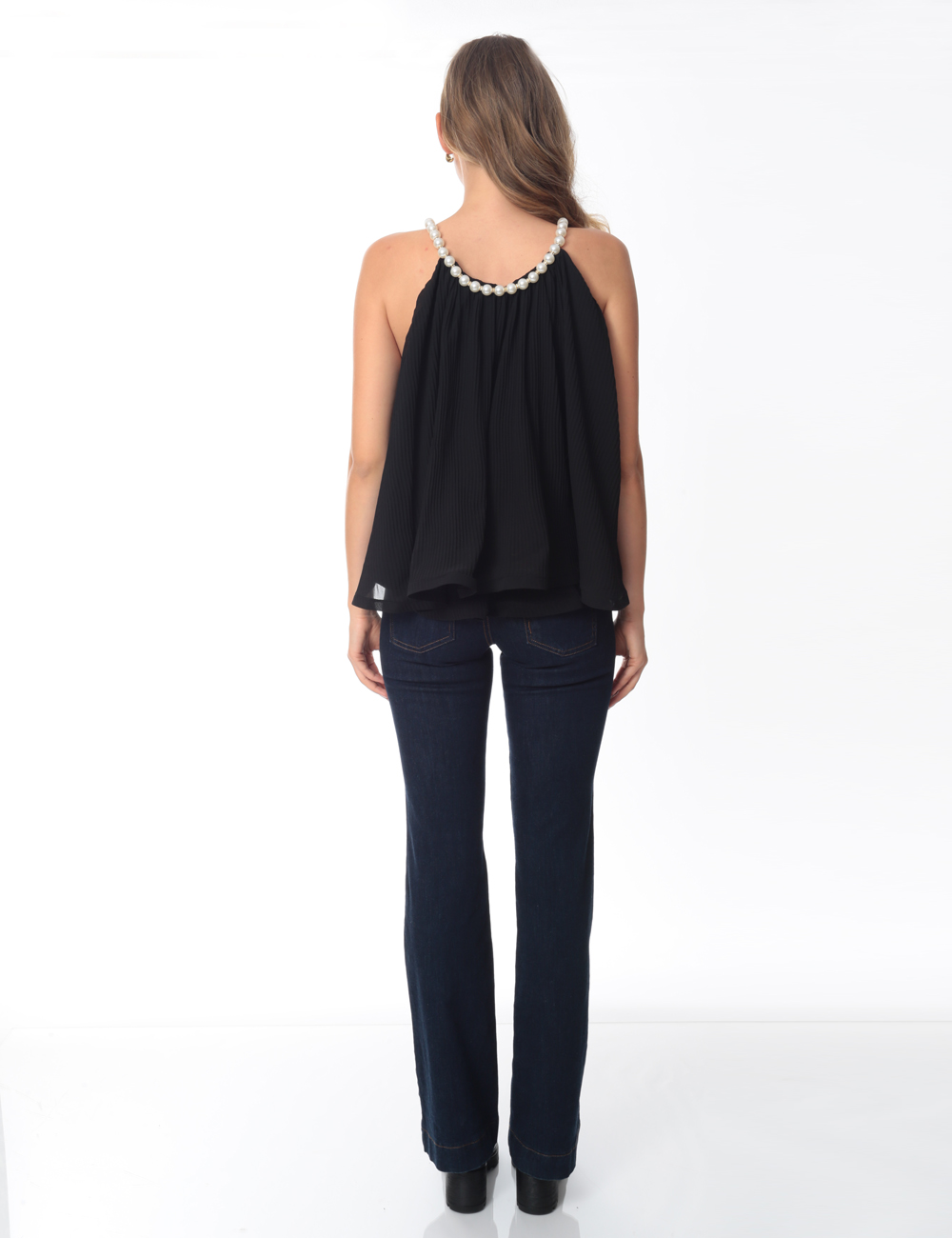 Black crinkle-textured sleeveless top in relaxed fit, featuring a pearl-embellished neckline.