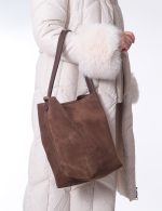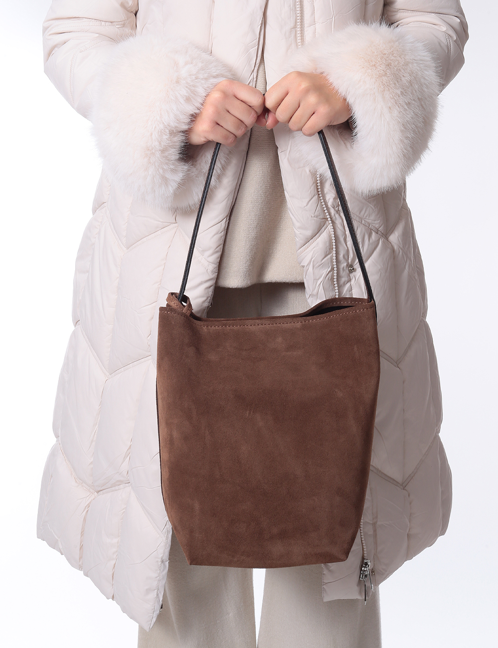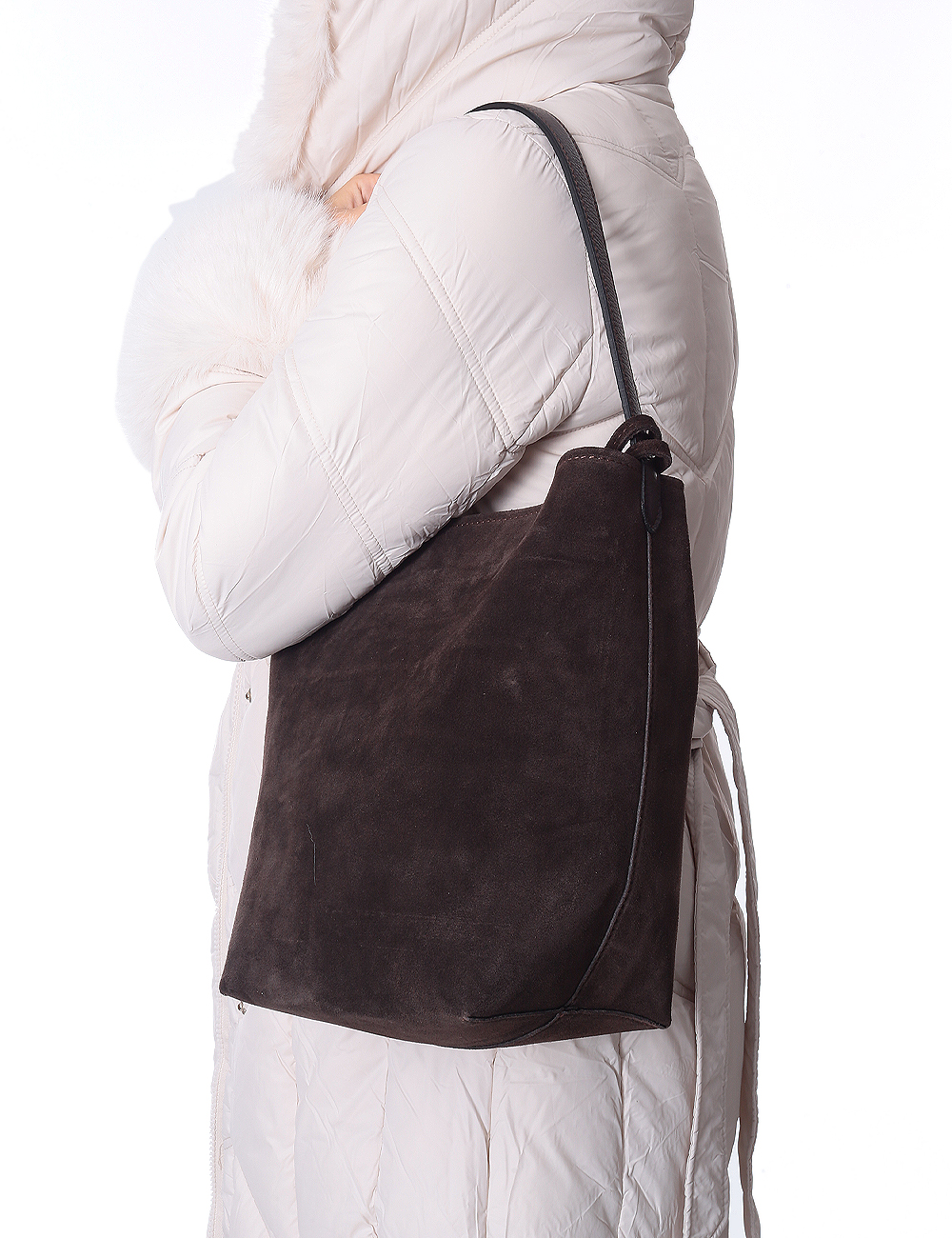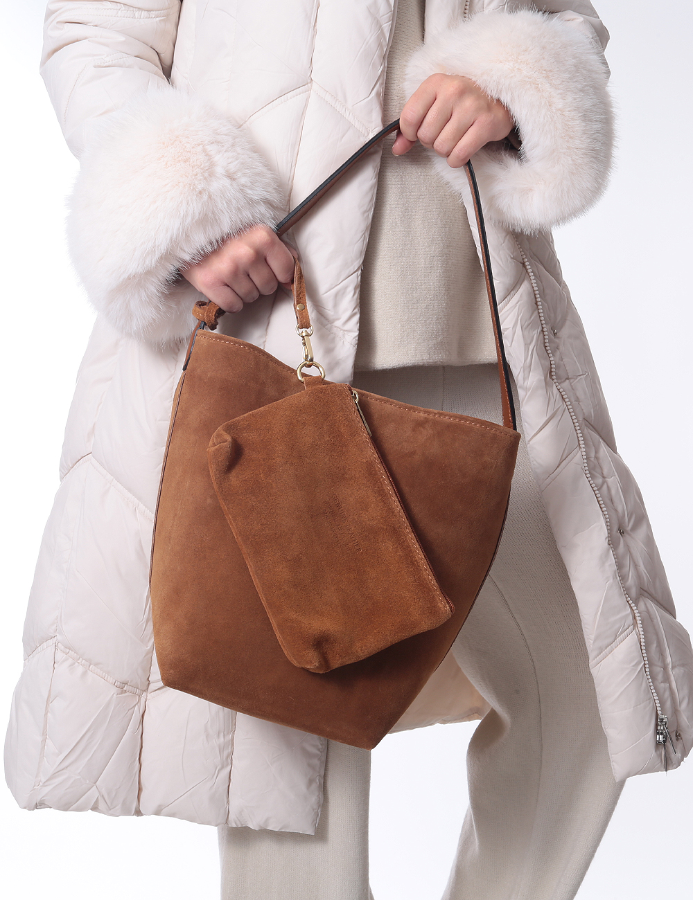 The Aria Tote is a leather suede shoulder bag with clean lines and a minimal silhouette. It features a spacious interior and a separate small pouch that can also be used on its own. Soft, lightweight, and practical for everyday wear.