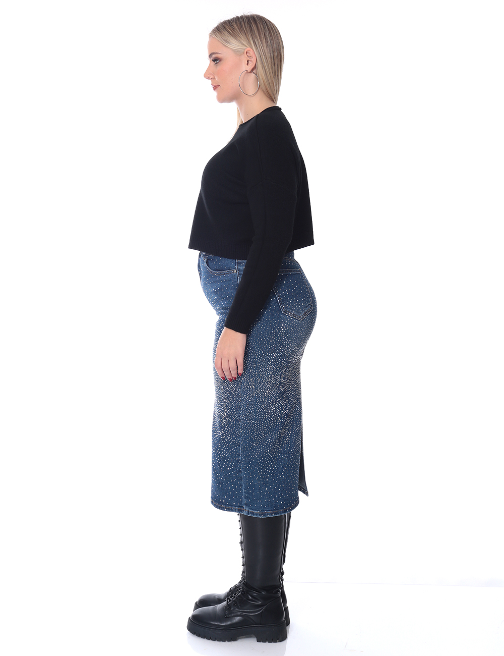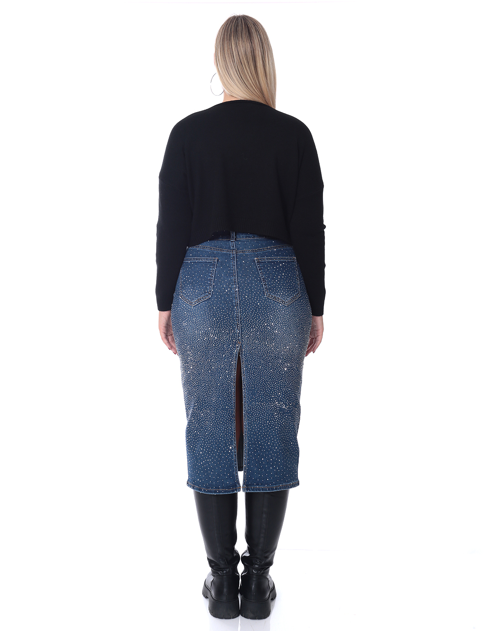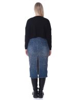 Midi-length denim skirt with a straight fit and a back slit for ease of movement. Embellished with rhinestones throughout for a subtle sparkle. Features classic pockets and a front zip-and-button closure.