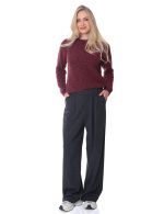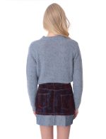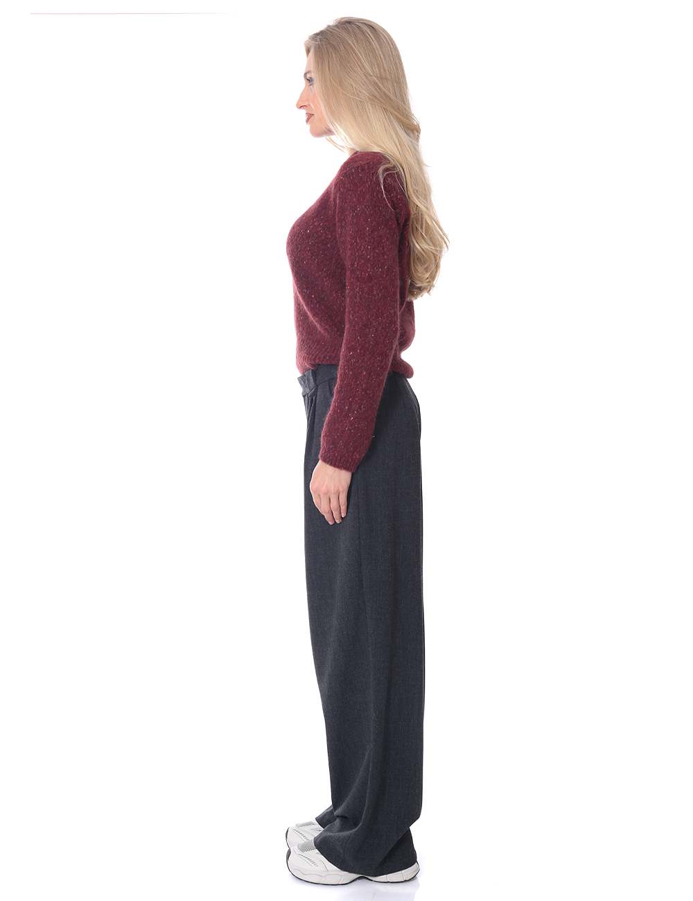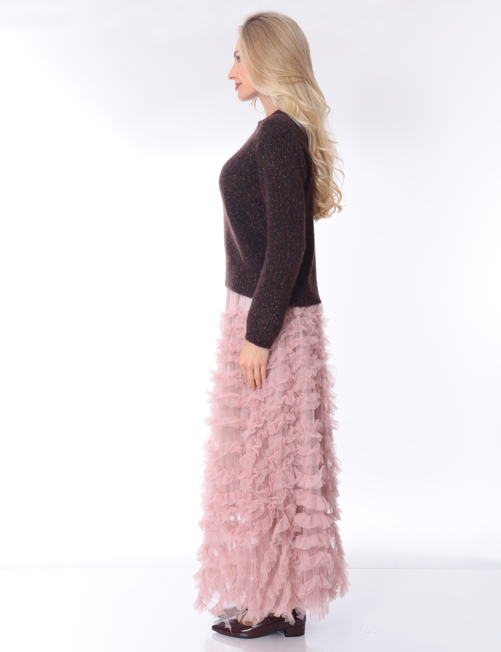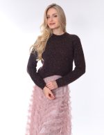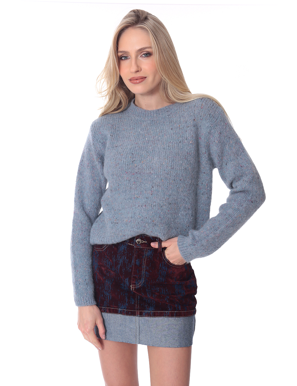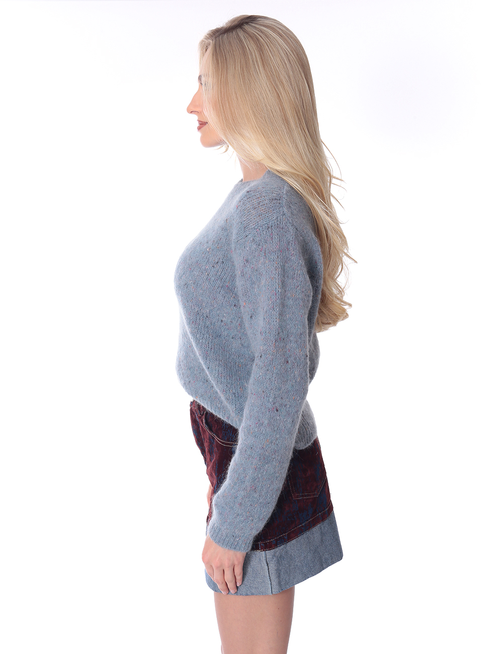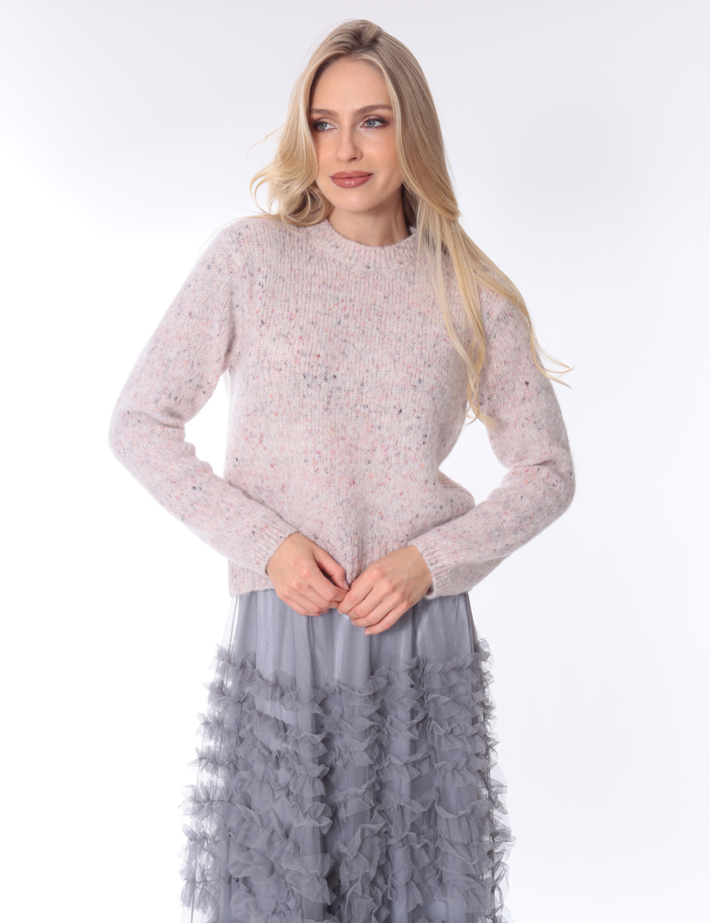 Soft knit sweater with slightly puffed sleeves and a round neckline. Made with multicolored yarn that creates a subtle speckled effect for a cozy, handcrafted look. Features ribbed hems and cuffs.