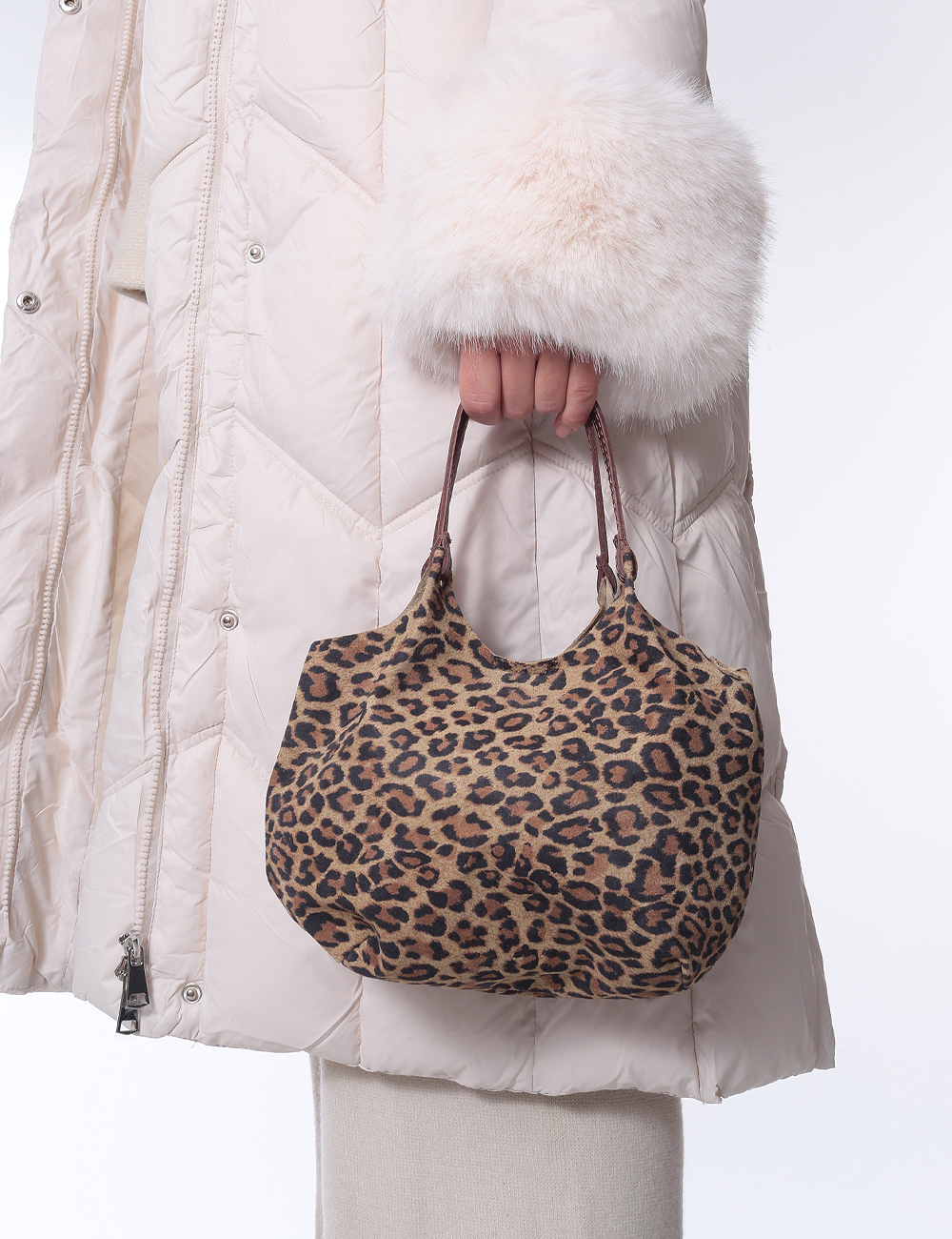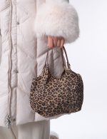 Leather tote bag in a leopard print, with a soft, flexible structure that drapes naturally against the body. Features double top handles and a detachable long strap for shoulder or crossbody wear. Spacious and lightweight — a bold statement piece for everyday looks.