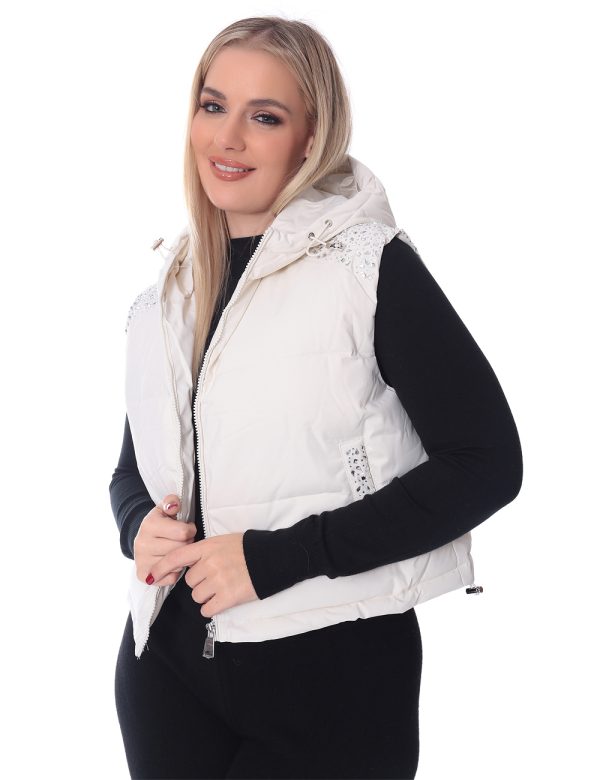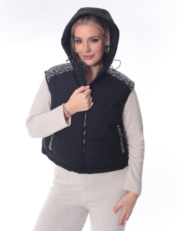 Μπουφάν καπιτονέ αμάνικο με στρας και κουκούλα