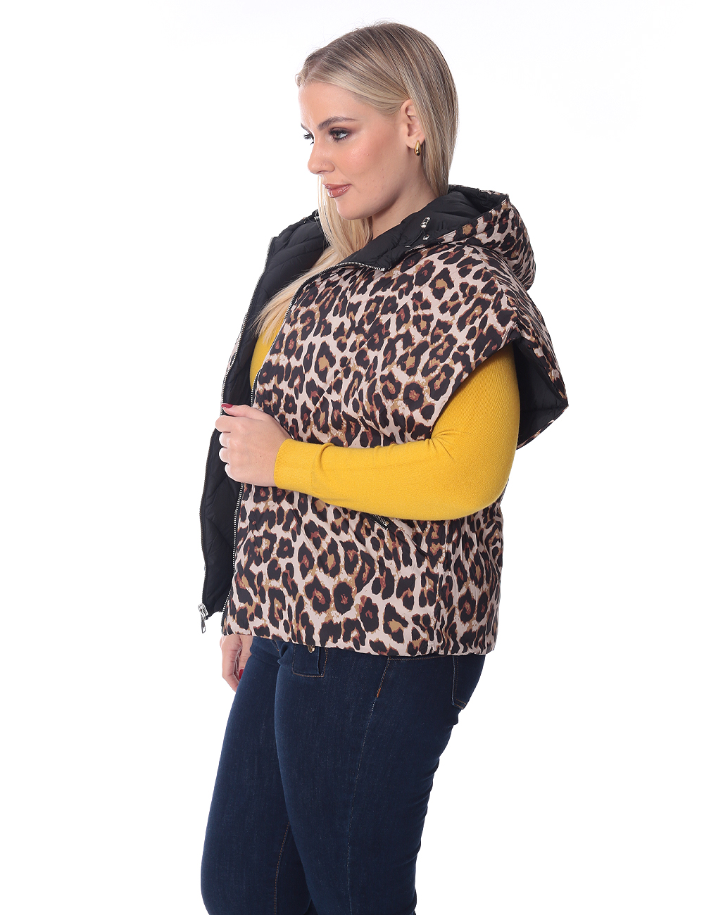 Αμάνικο καπιτονέ μπουφάν διπλής όψης με κουκούλα και φερμουάρ. Η μία πλευρά διαθέτει animal print σχέδιο, ενώ η άλλη είναι μονόχρωμη για πιο διακριτική εμφάνιση. Ζεστό, ελαφρύ και πρακτικό, ιδανικό για κάθε καθημερινό look.