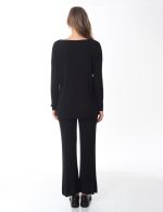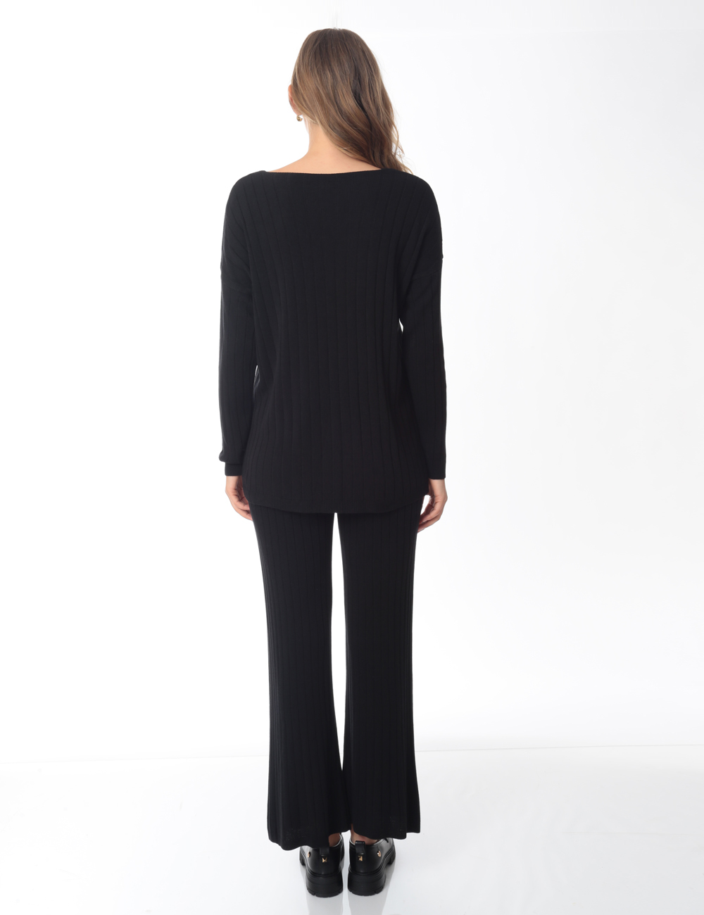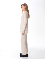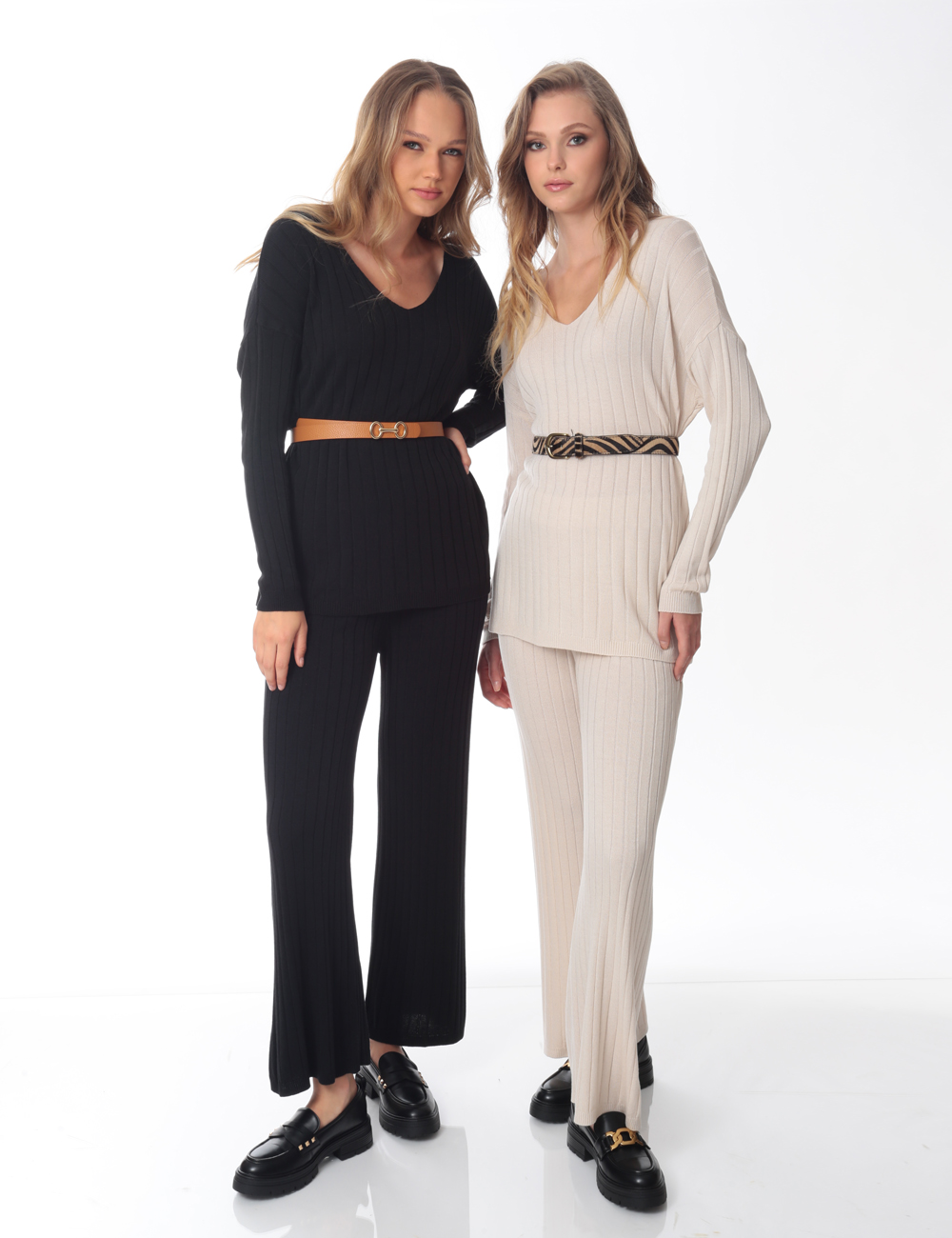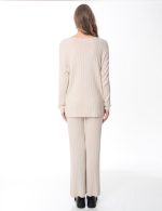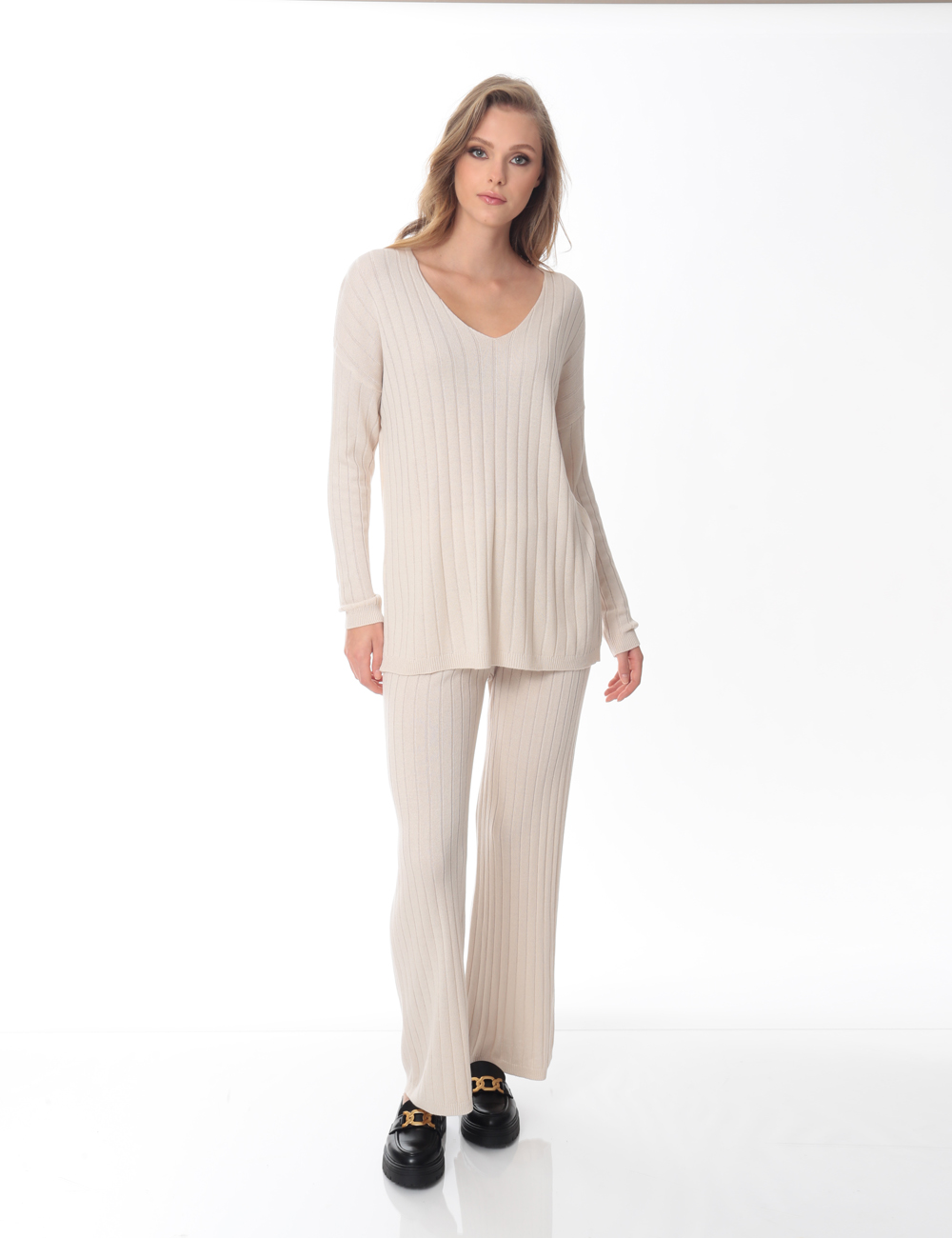 Ριπ σετ σε απαλή υφή, με μακρυμάνικη μπλούζα V λαιμόκοψης και παντελόνι σε χαλαρή ίσια γραμμή.