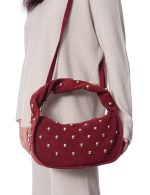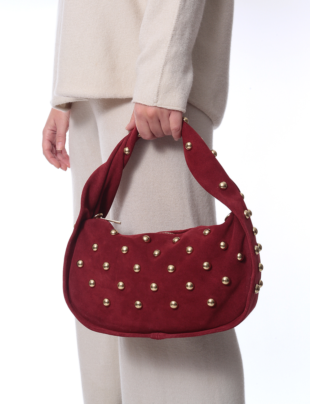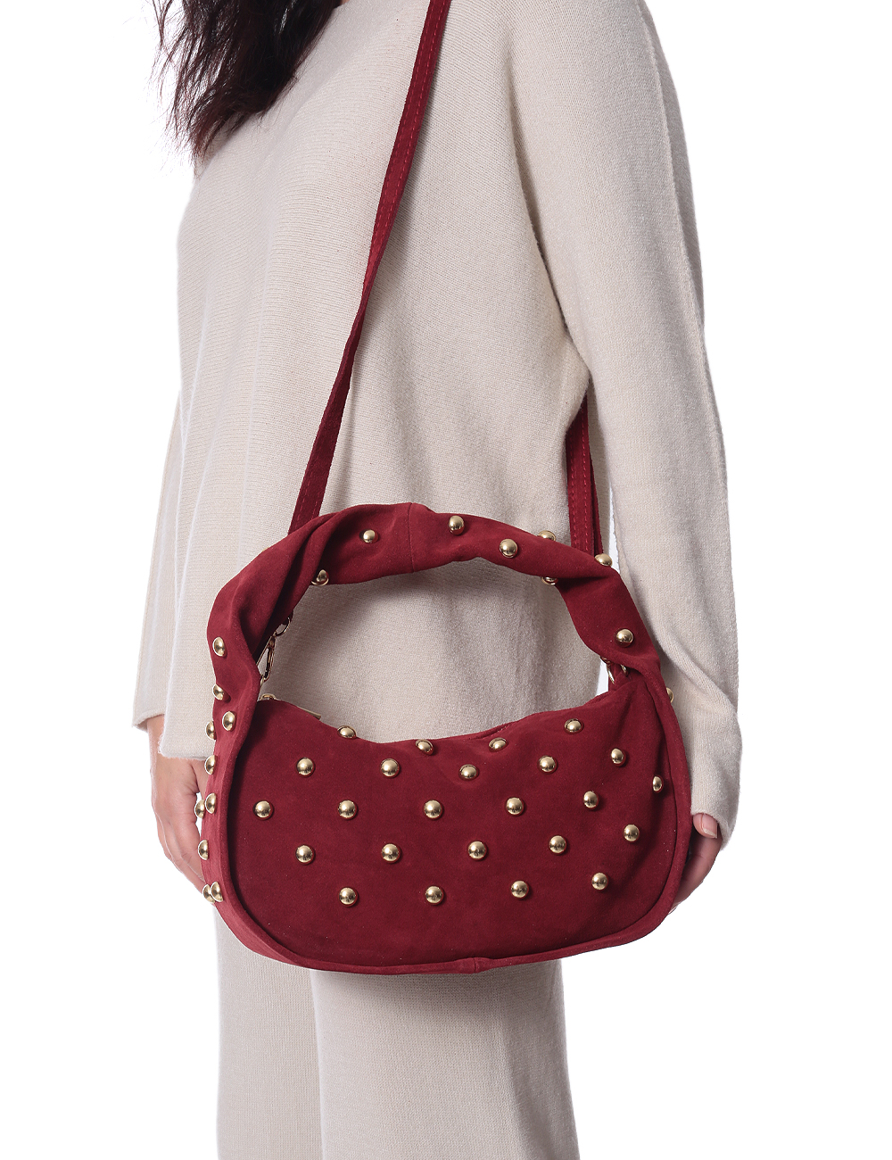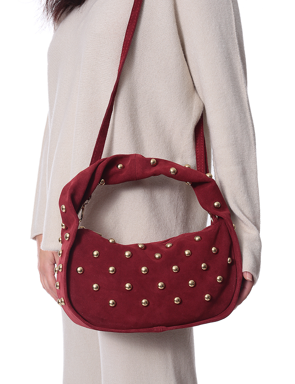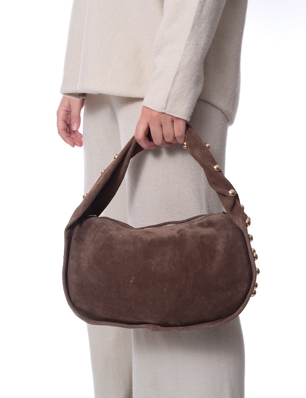 Τσάντα χειρός σε καφέ suede υφή, με χρυσά στρογγυλά studs στο μπροστινό μέρος και λουρί με λεπτομέρειες studs. Μαλακό σώμα και άνετο κράτημα.